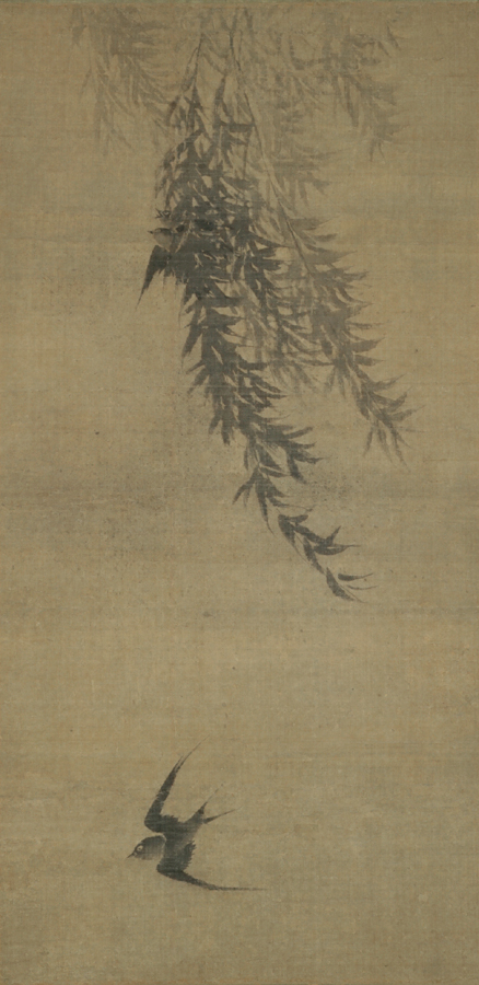 雨滴をふくんだ数条の柳の小枝に風が吹きわたり、飛沫がとびちる。たちさわぎながら枝にしがみつく二羽の燕と、風に向かって飛び去る一羽の燕。鋭い自然観照によって把握された密度の濃い描写には、実存感がみごとに表現されている。牧谿は中国南宋時代末期の蜀出身の禅僧で、諱は法常、牧谿は号である。中国での評価はあまり高くないが、我が国では「和尚の絵」と呼ばれ、室町時代に珍重され、画人の手本としても多大な影響を与えた。五代将軍綱吉が元禄十一年(一六九八)三月十八日、尾張家麹町邸に御成の際に、二代光友が拝領した。