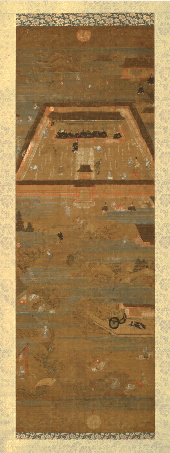 石清水八幡宮は貞観元年(八五九)大安寺僧行教により宇佐八幡宮から勧請され、京都府八幡市の男山に鎮座する。男山全体の景観を俯瞰的にとらえ、すやり霞で区画して、そこに遷座に伴う数々の奇瑞譚を描いている。回廊に囲まれた本殿の前では、遷座の儀式が執り行われている。画面の上部に日輪、下部に月輪を配し、縁起絵のみならず礼拝画としての性格も備えている。樹木、岩などの描法には新手法も窺われ、制作は鎌倉時代末期から室町時代初期と考えられる。