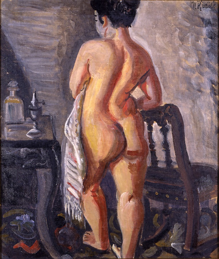 小出楢重は大正15年、美術雑誌『みづゑ』四月号に「裸婦漫談」という一文を載せている。「支那寝台の裸女」などに代表される、裸婦の画家小出ならではの警句にあふれたエッセイである。特に興味深いのは、日本人である画家が、油彩によって日本人のモデルを用いて裸婦を描く場合、躊躇せざるを得ない二つの点の指摘である。一つは、西洋の美の規範で理想化しかねる形体と色彩の処理。あと一つは裸婦を置く背景の問題である。日本女性の体は確かに西洋人とは異なった比例を有するが、小出楢重はそれは充分美しいと主張する。しかし水浴図などのなどの伝統をもたず、浮世絵の中の遊郭や浴場に裸婦を見てきた日本人の目に、いかにして新しい裸婦を馴染ませるのかに画家は苦心するという。この作品では、日本髪の女を洋室の小部屋に据えることで、画家は一つの均衡を保とうと試みている。構図の中心に背面で立つ裸婦の重心は、うなじから背中を通り脚に抜けるS字曲線と、左右の小道具、左の脇机とその上の香水瓶、右の後向きの椅子によって安定しているのである。(荒屋鋪透)
