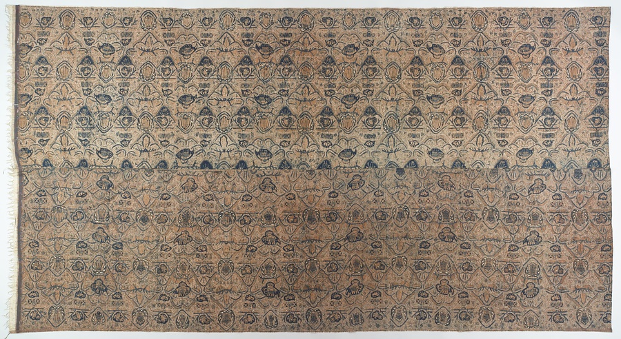 茶地に白抜きの点描(でんびょう)で地模様をあらわし、「宇宙の中心」を象徴する霊山をはじめ、ヒンドゥ教の神聖な鳥であるガルーダ、生命の樹、動物といったスメン(ジャワの世界観を象徴した文様)を密に配します。藍と茶褐色(ちゃかっしょく)のソガ染料によって染められ、カイン・ソガと呼ばれています。