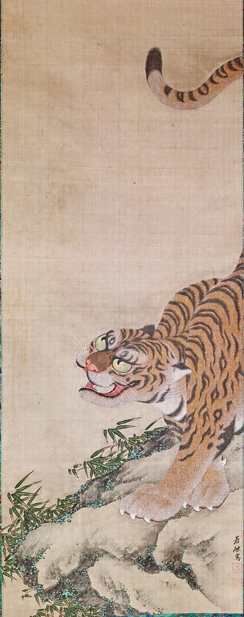 有名な川柳に「猫でない証拠に竹を画きて置」というのがあります。この絵も笹の葉を描くことで、この獣が野生の虎であることを示してはいますが、その顔つきは、飼い主に甘えようとする猫そのものです。