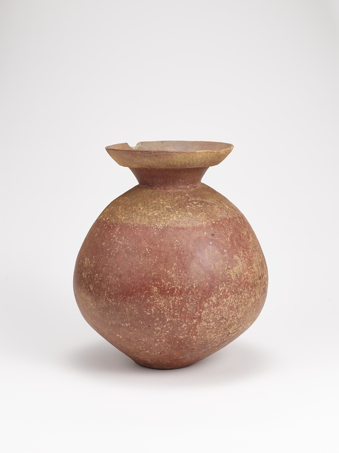 やや下膨れの胴部と小さな平底、強く締まる短い頸部と大きく開く二重口縁を持つ、関東地方古墳時代前期頃の二重口縁壺である。胴部上半と口縁部に、櫛状工具による密な平行沈線を交差させるように斜めに施し、細かい斜格子文状の文様帯を形成している。この文様帯と底部を除く胴部外面のほぼ全体に赤色顔料を塗布し、細かい磨きによって仕上げる、赤彩土器のひとつである。