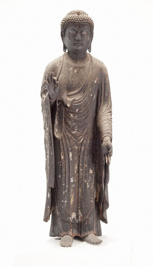 針葉樹材の寄木造で目は玉眼。漆箔像。来迎印を結び蓮華座(後補)に立つ阿弥陀如来像