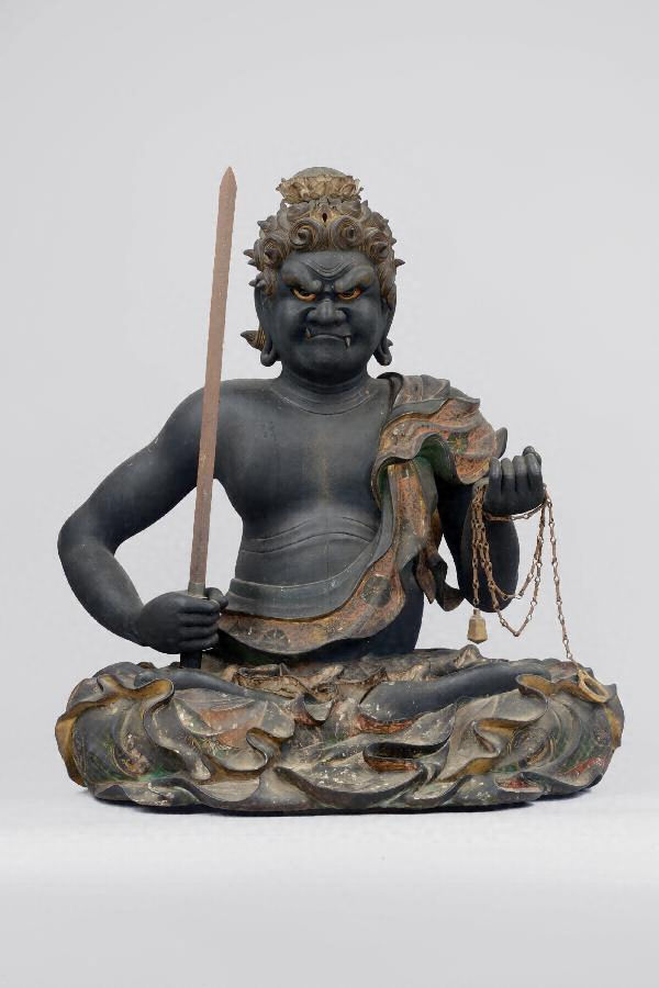 本像は、不動明王像を中央に、向かって右に矜羯羅童子像、左に制多迦童子像が配されている。不動明王像は、坐像ながら上半身を強く左に捻(ひね)り、右肘(ひじ)を大きく外に張って力のこもった表現をみせている。矜羯羅童子像は、通例のように合掌して直立するが、制多迦童子像は、顔を斜め上に向けて口を開け、左足を大きく踏み上げて両手を前後に振り上げた活気のある姿である。
