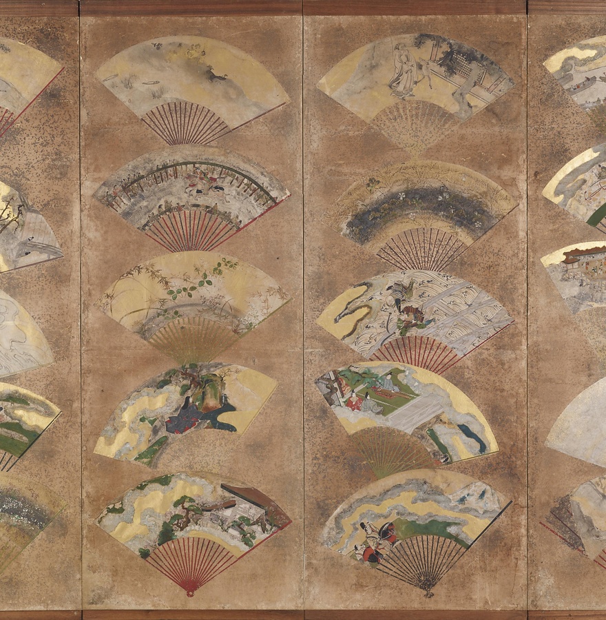 安土桃山時代から江戸時代初期(17世紀初頭)にかけて活躍した絵師、俵屋宗達は、扇屋「俵屋」を営んでいました。この屏風は、俵屋の製品であったと考えられています。扇は、日常の実用品であることに加え、贈答品としても盛んに流通していました。この屏風に貼り交ぜられた扇面画には、扇の折り畳み線がなく、またサイズも大きいことから、実用目的ではなく、初めから鑑賞のために屏風や冊子状に仕立てることが想定されていたのでしょう。扇屋は、さまざまな扇のデザインをストックしてあったはず。これは、まるで俵屋の図案のレパートリーを見せるカタログのような屏風です。