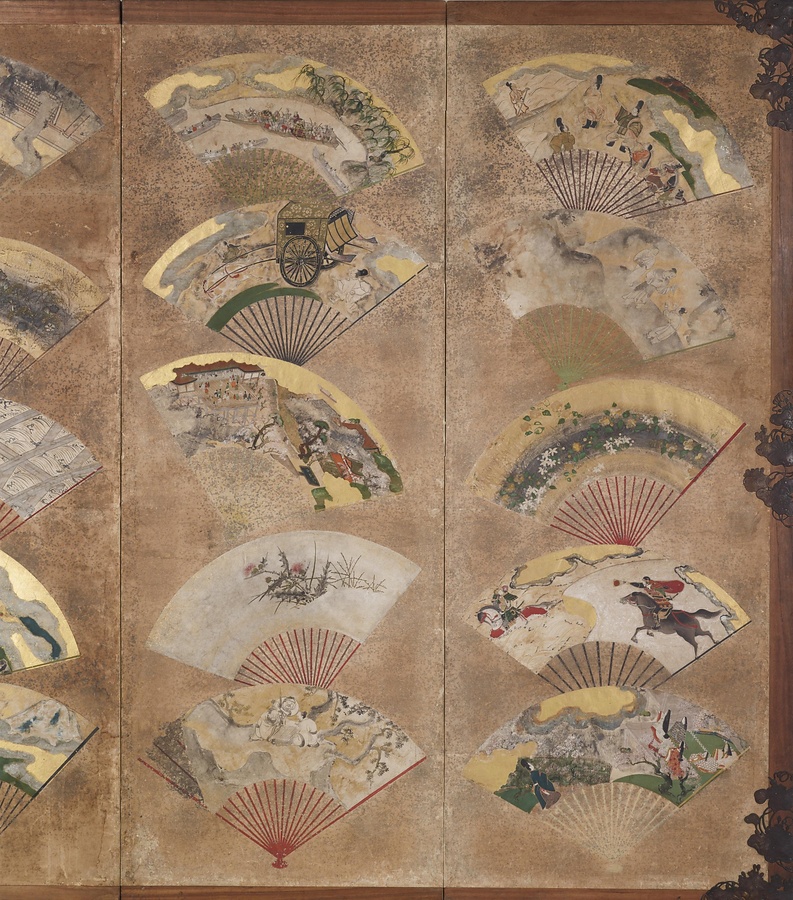 扇の形をした画面に、さまざまな絵が描かれ、屏風に貼られています。この屏風は本来、2枚でセットになっており、こうした「扇面画」が、左右の屏風を合わせると60枚、貼り交ぜられています。描かれている内容は、「源氏物語」「伊勢物語」「平家物語」といった物語絵、有名な景色を彩り豊かに描いた名所絵、昔から伝えられてきたエピソードや人物を含む故事人物、風景や動物をモノクロで描いた水墨画など、幅広い画題を網羅しています。