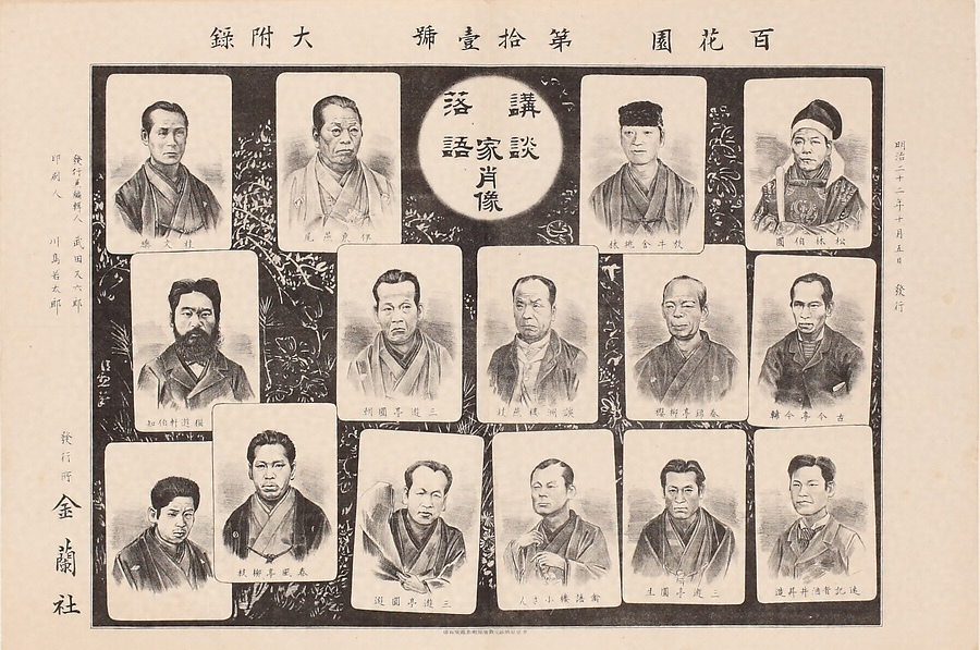 速記雑誌『百花園』の付録。講談師や落語家に加え、画面右下に速記者の酒井昇造を描く。従来の浮世絵風の人物表現とは一線を画し、口演者らの個性を捉えて表そうとする姿勢が垣間見える。