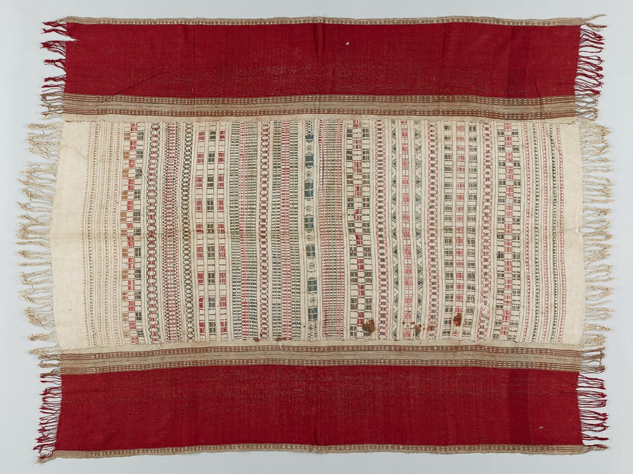 3枚の木綿布を縫いつなげて1枚の大きな肩掛けにしています。中央の布が一番幅の広い機で織られ、赤と緑の緯糸による浮紋織で幾何学的な文様を段状に織り出しています。その両脇には、幅の狭い機で帯状に織られ濃い臙脂色の布を縫い合わせています。