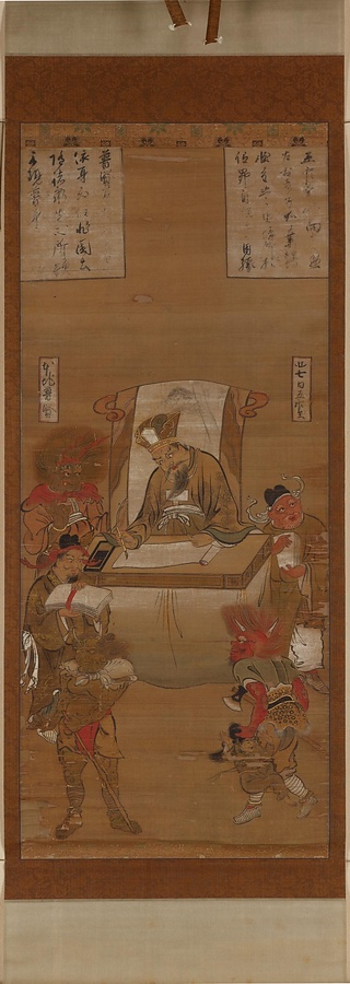 仏教には、人が亡くなると、生きていた時の罪について十人の地獄の王の下で裁きを受ける、という考えがあります。その王たちの裁判の様子を描いたのが十王像です。亡くなった日を1日目として、49日目までの7日ごとに秦広王 (しんこうおう)、初江王(しょこうおう)、宋帝王(そうていおう)、五官王(ごかんおう)、閻魔王(えんまおう)、変成王(へんじょうおう)、太山王(たいざんおう)が裁きを行い、それでも結論が出ない場合は、100日目に平等王(びょうどうおう)、1周忌に都市王(としおう)、3回忌に五道転輪王(ごどうてんりんおう)が裁判を行います。このような過程を経て、亡くなった人が極楽浄土に行くのか、それとも地獄に行くのかが決まると信じられていました。