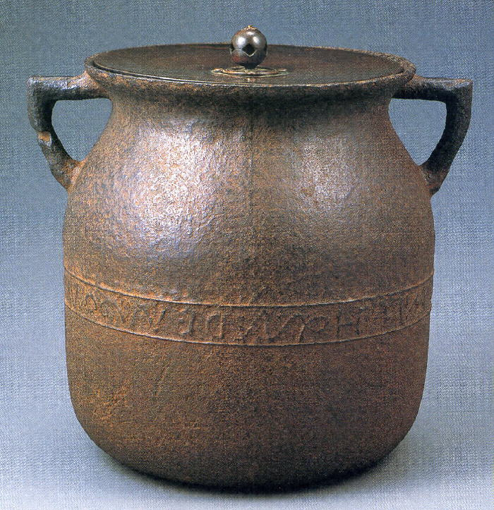 遠州の釜師の一人、大西淨久の作と伝えられているもので、胴の中程のところに、オランダ文字が地紋としてめぐらされている大変珍しいものである。鐶付は唐犬耳文様に大きく張り出している。