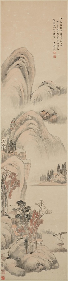 銘文:「山色皴紅葉、鐘声閣白雲、師大痴秋山図略用峰□図意、隠菴大兄大人清賞、弟呉大澂」の題と「呉大澂」(朱文方印)、「清卿」(白文方印)がある。