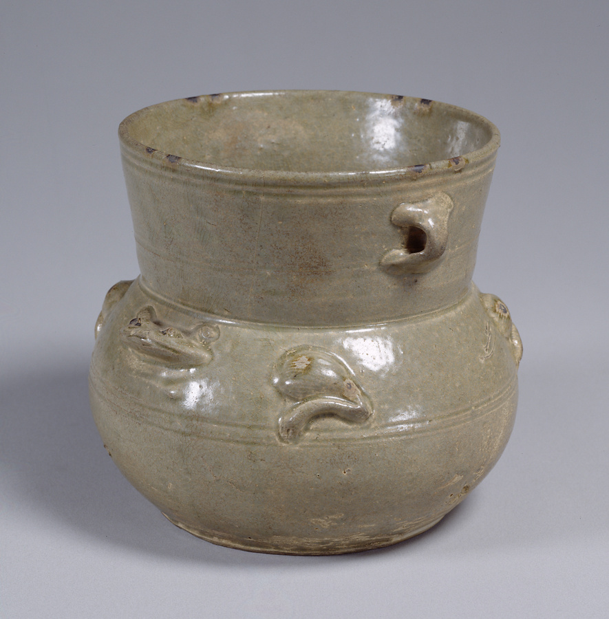 現在の浙江省一帯でつくられたいわゆる古越磁(こえつじ)には、実在の動物の姿を写しながら、本来は無い翼を装飾したものがあり、宗教的な目的のもとにつくられたことがうかがえます。さらに西晋末から東晋になると、鉄分を含んだ顔料を効果的に散らす装飾が流行しました。
