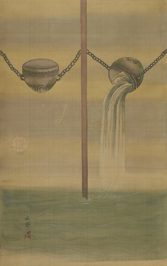 「荀子」に記される「宥坐之器」を絵画化したもの。欹器は適量の水を入れれば水平を保つものの少なくても入れすぎても傾くことから何事も適量が肝要であると説く。小襖を掛幅装に改変したもので、左右それぞれに引手跡がみえる。秋暉の数少ない鑑戒図の一つ。
