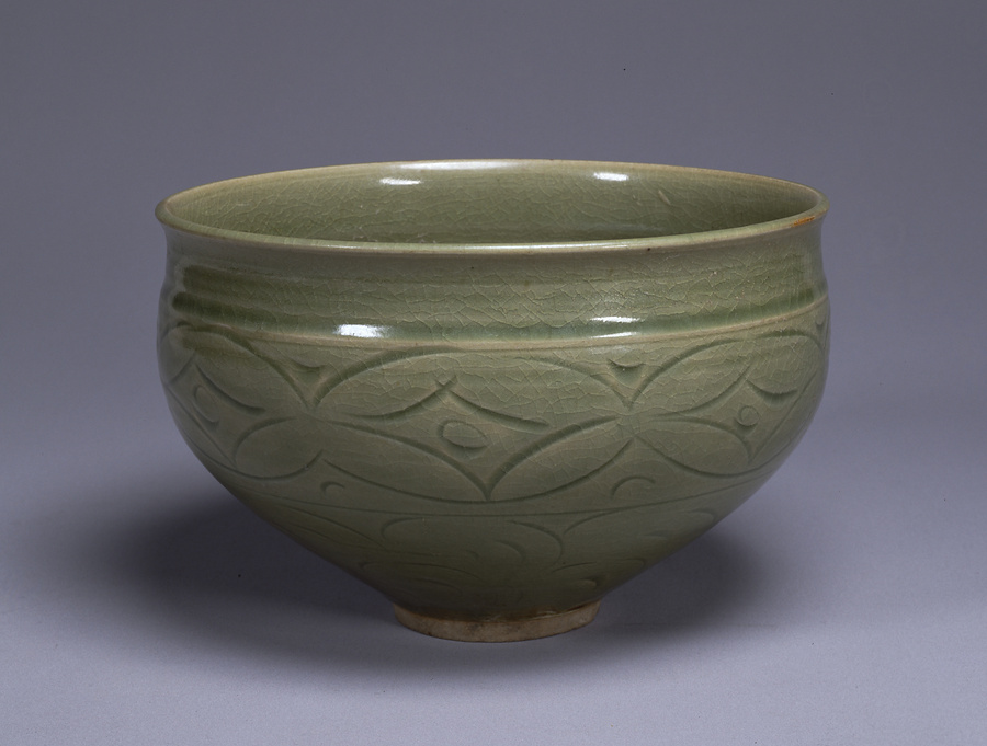 青磁蓮池文深鉢