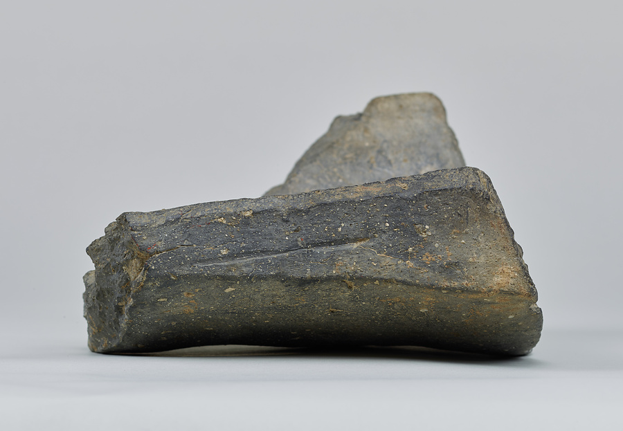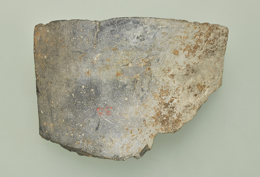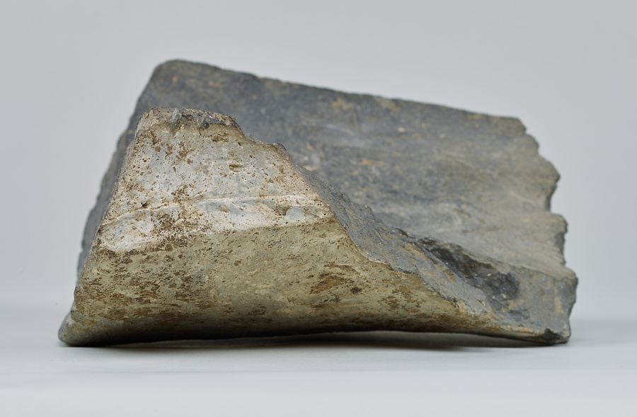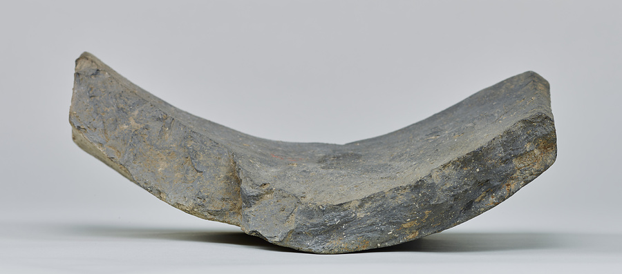 中央の宝珠飾+ほうじゅかざり+から忍冬+にんどう+唐草が左右に伸びる文様の、法隆寺式と呼ばれる軒平瓦。この瓦はもともと法起寺+ほっきじ+の創建時のもので、法隆寺では破損した瓦と差し替えるために持ちこまれた。両端が本来の幅より切り詰められており、小ぶりな建物に葺かれたものであろう。