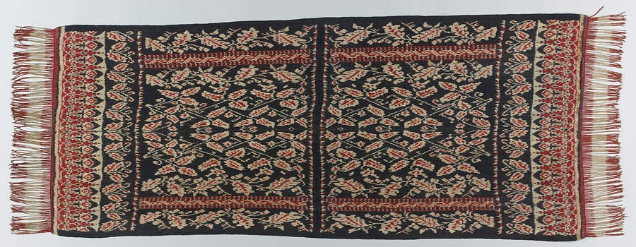 経糸を白と赤の絣に染めて文様を織り出した経絣のイカットです。ほぼ黒に近い紺地に赤と白で文様を表わす色使いや、両端にギザギザの鋸歯文様を配し、中央部に草花のパターンを繰り返すデザインは、ロティ島におけるイカットの特徴です。