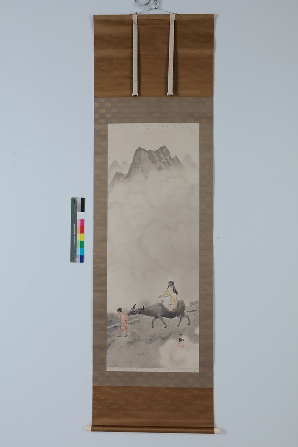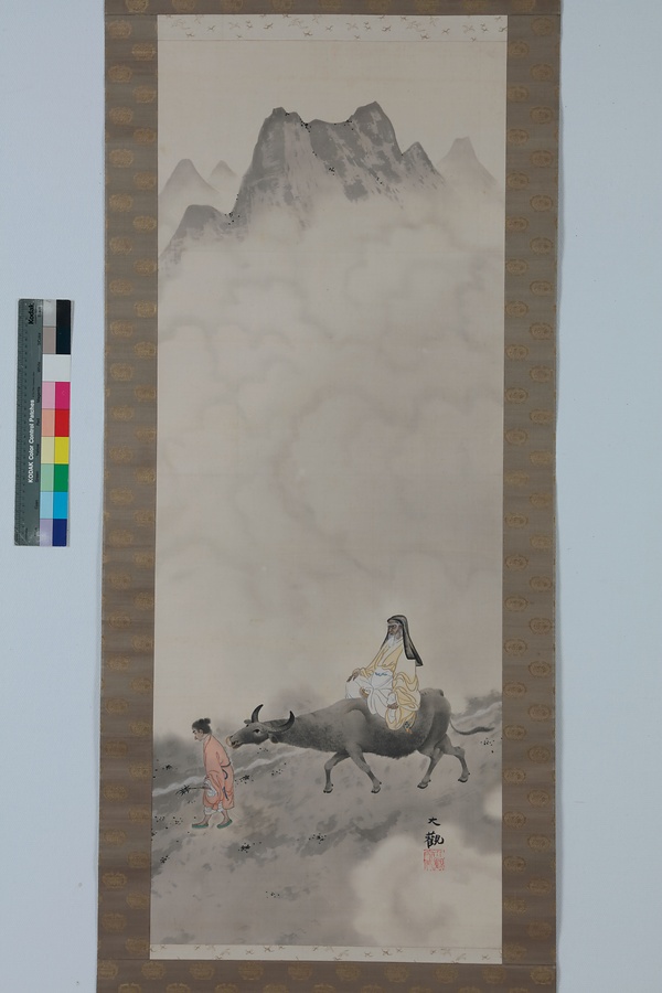 本作「老君出関」に描かれている牛にまたがった人物は道家の祖、老子である。周の役人であった老子は、国が衰微するのを憂いて身を隠すため函谷関(かんこくかん)という関を越えるが、その時、関所の役人の求めに応じて書物『老子』を遺し、その後仙人になったと伝えられている。