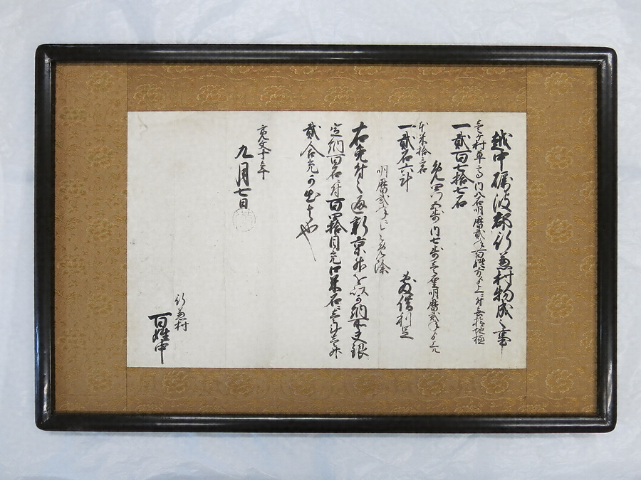 村御印とは江戸時代前期に加賀藩が領内(現富山・石川両県)各村に配布した年貢徴収令状(割付状)。はじめ慶安2年(1650)に出され、その後、加賀前田家3代当主・前田利常(1594~1658)が晩年に行なった農政改革「改作(仕)法」が成就した、明暦2年(1656)8月1日付で出された。更に寛文10年(1670)9月7日付でも出されており、これは幕府にならい加賀藩も「新京枡(1升≒約1.8㍑)」を採用し改められたものである。この時以前のものと交換されたので、現存するほとんどはこの日付のものである。当時利常は没していたが、村御印(改作法)は利常の功績であるので、最後に利常の印「満」が捺されている。村御印の「御印」とはこの印のことである。