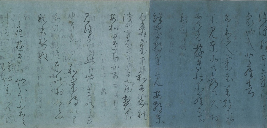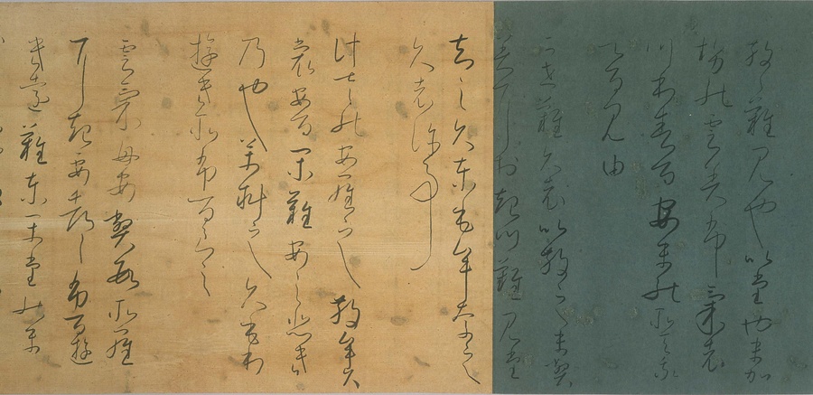 全部で20紙あり、白紙のほか藍、茶、黄、緑の濃淡のある染紙を継いだ彩りの豊かな色紙を用いています。第1紙から第15紙には和歌48首が書写され、第16紙から第20紙には、中国・東晋時代の王羲之の書状11通を写しています。第1紙は小野道風筆、第2紙以下は和様の書を完成した藤原行成筆と伝えられますが確証はありません。