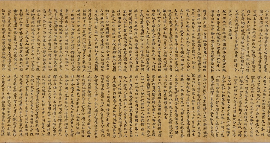 この経の特徴は、なによりとても細かい字で書かれていることです。経は通常、1行17文字、1段で書き写すものですが、この経は1行34文字、さらに上下2段に書き写しています。このような形式を、細かい字の経と書いて「細字経」と呼びます。「細字経」の例は、古くは中国の唐時代までさかのぼります。本来は、八巻や十巻になる長い経を細かい字で書き写すことによって、一巻あるいは二巻に仕立てて、携帯の便宜をはかるためにつくられたのがその始まりといわれています。この「報恩経」も、もとは全7巻の経ですが、現在展示されている1巻に巻第三から巻第七までが収められています。