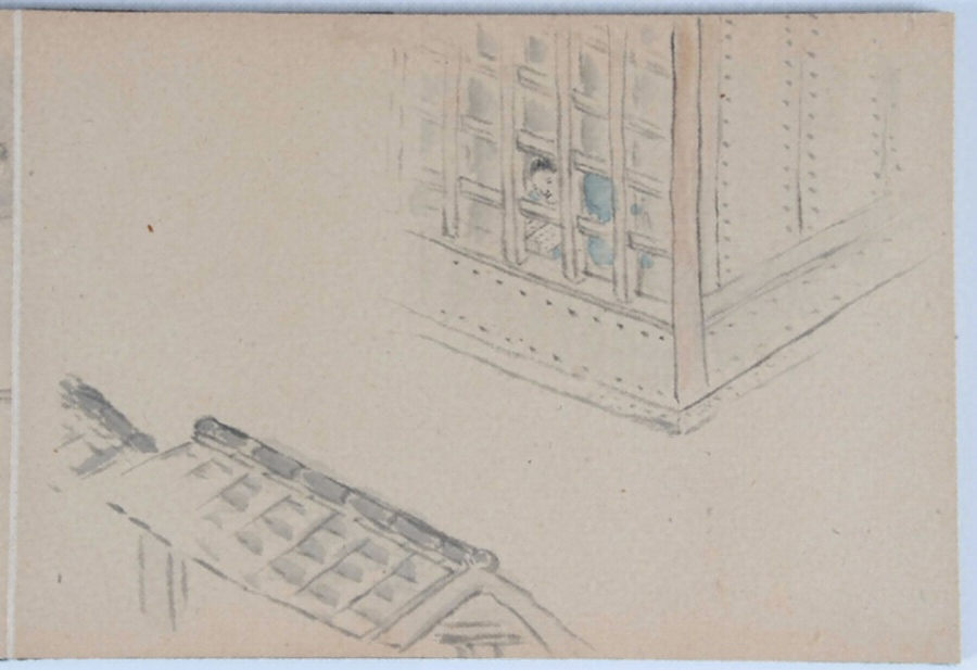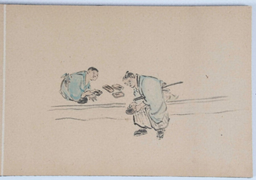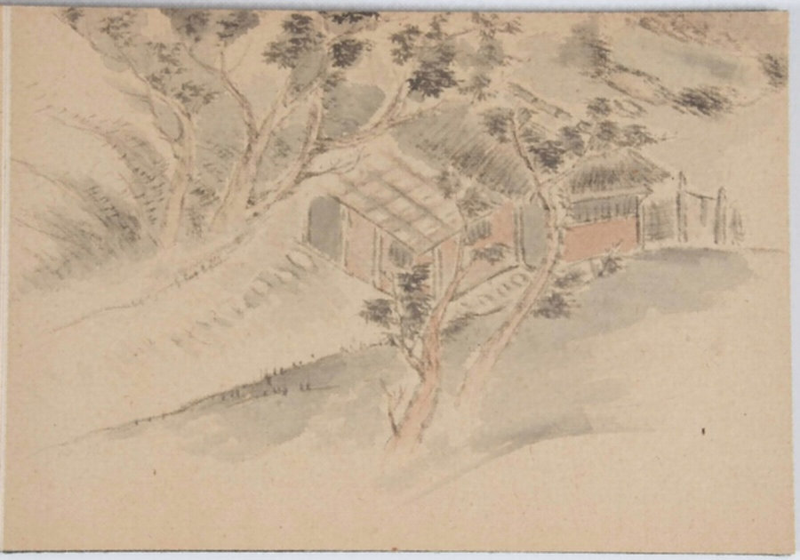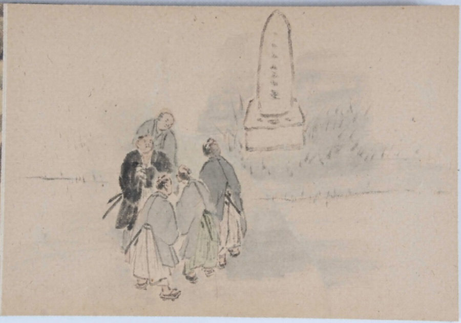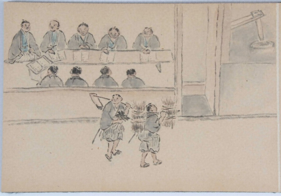 吉田松陰の一生を絵でつづった珍しい資料。松陰門下最後の生存者として知られる渡辺蒿蔵〈こうぞう〉の実兄(号は奇陳、渡辺小五郎か)が描いた。松陰の誕生から刑死後まで、15の場面からなるが、うち13枚を蒿蔵の兄が描き、最後の2枚を蒿蔵の娘八百〈やお〉が描き足した。蒿蔵が大正15年(昭和元年、1926)に寄せた序文には「家兄奇陳居士、嘗て松陰伝を読みて感激し、其の状態を描写するを措く能ず」(原漢文)とある。絵心のあった兄が、塾に学んだ弟の蒿蔵から様子を聞きつつ、描いていったものと考えられる。