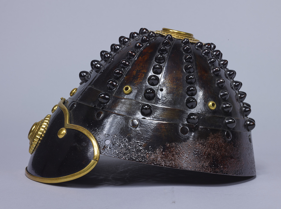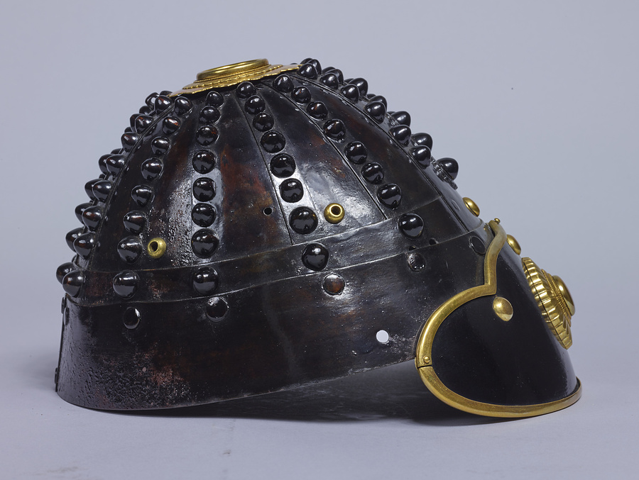 鎌倉時代後期の星兜を参考に明治時代に製作された作品。枝菊文高彫の鍬形台に長鍬形を挿す。吹返には藻獅子韋を張って枝菊に蝶高彫の据文を打っている。の裾にも裾金物を打ち、紫糸の地に白・萌黄・紅をV字形に配した逆沢瀉威の華やかな仕立てである。