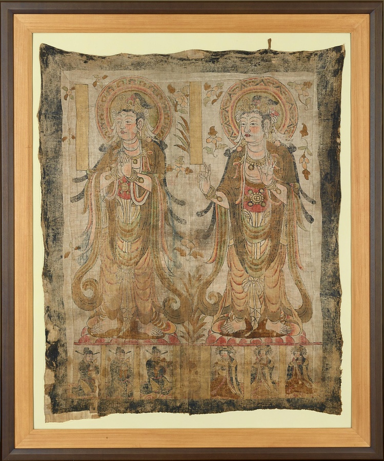 画面の下部には、男女の供養者坐像各三体と空白のまま残された銘文を書く欄および短冊型(たんざくがた)があります。そのため、追善供養(ついぜんくよう)のための遺族からの注文を見越して、前もって工房が製作していたことをうかがわせます。上辺には羂【わな】とよばれる当初の掛け紐【ひも】が残っています。(勝木氏執筆)(20170822_t033)