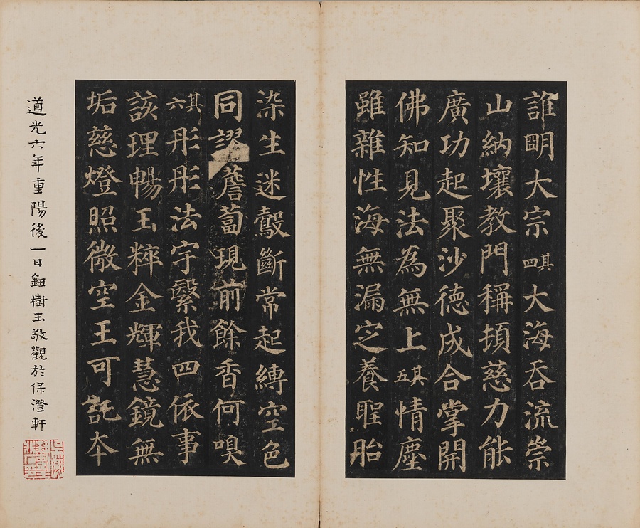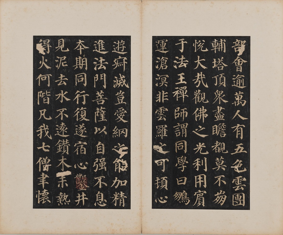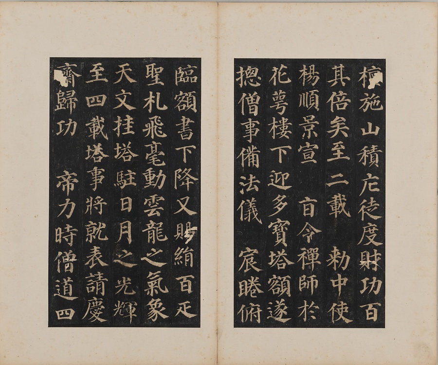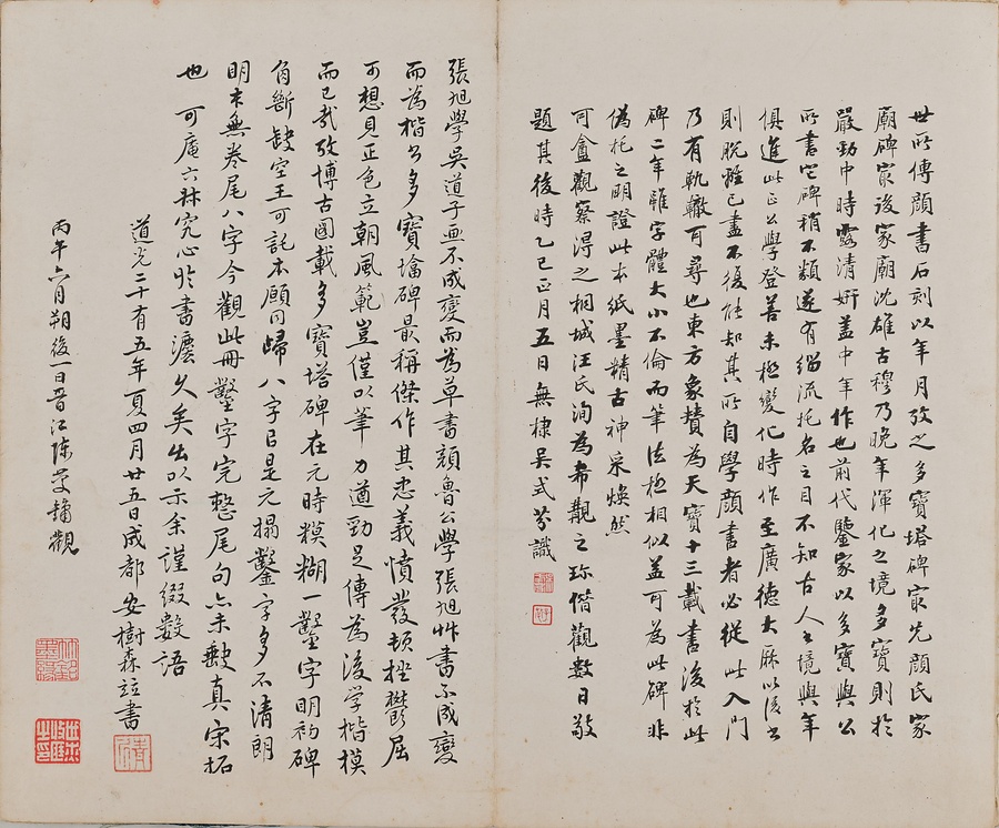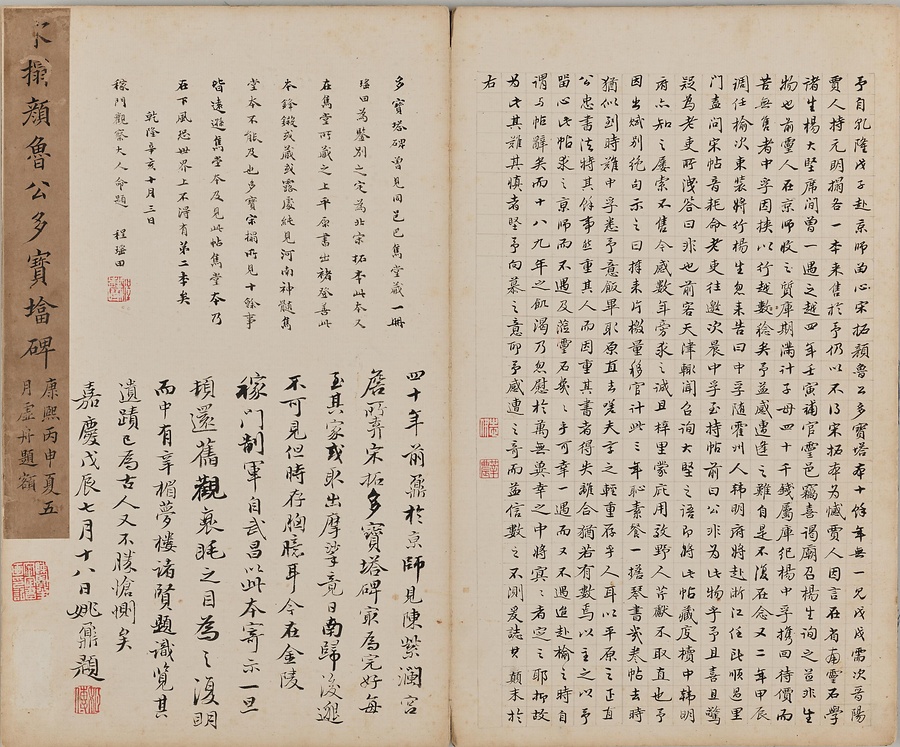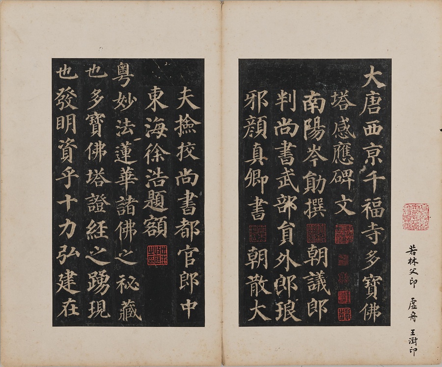 長安の千福寺の多宝塔の建立経緯を記した石碑。本文は唐の能書、顔真卿の44歳時の書。碑石は西安碑林博物館に現存します。本作は碑帖に精通した清の王澍@おうじゅ@が鑑定した宋拓本。摩滅が少なく文字の輪郭が鮮明です。王澍のほか、銭大昕@せんたいきん@、伊秉綬@いへいじゅ@、王文治@おうぶんち@ら碑学・帖学の名家が題跋を付します。