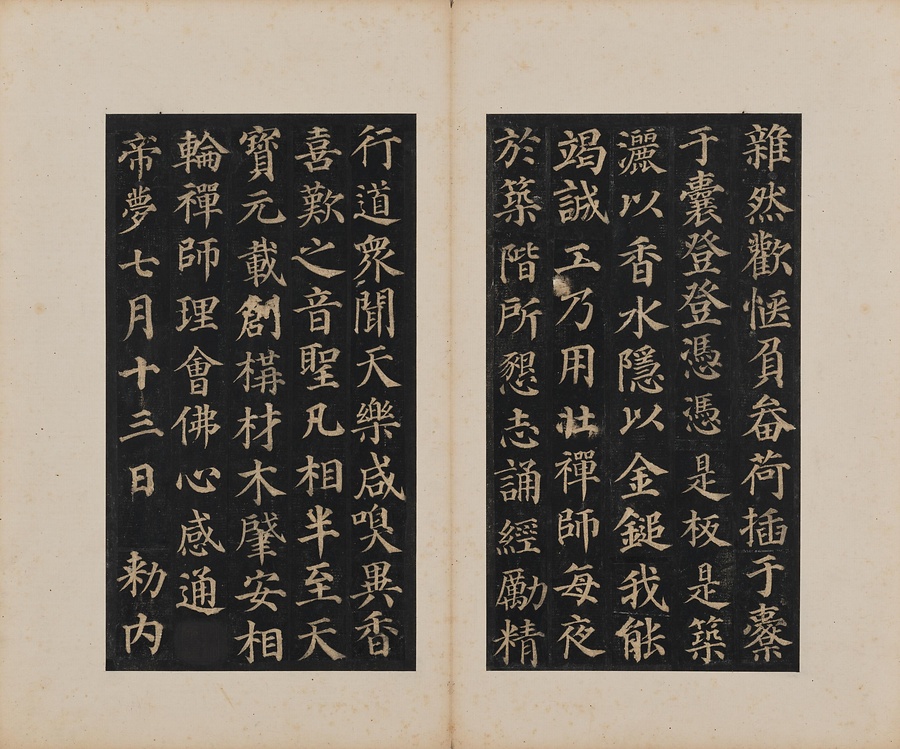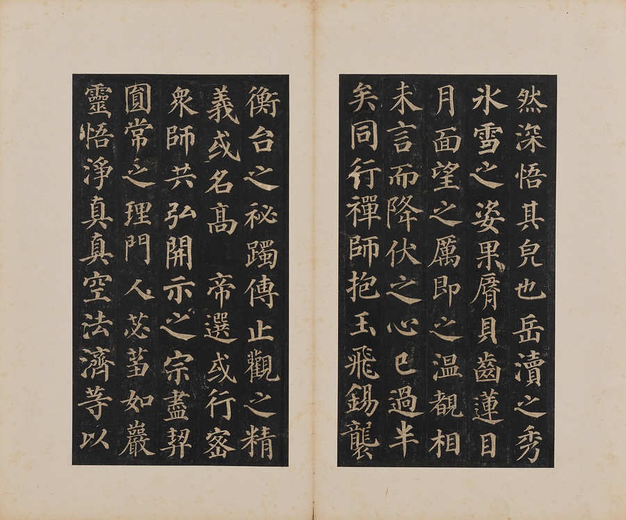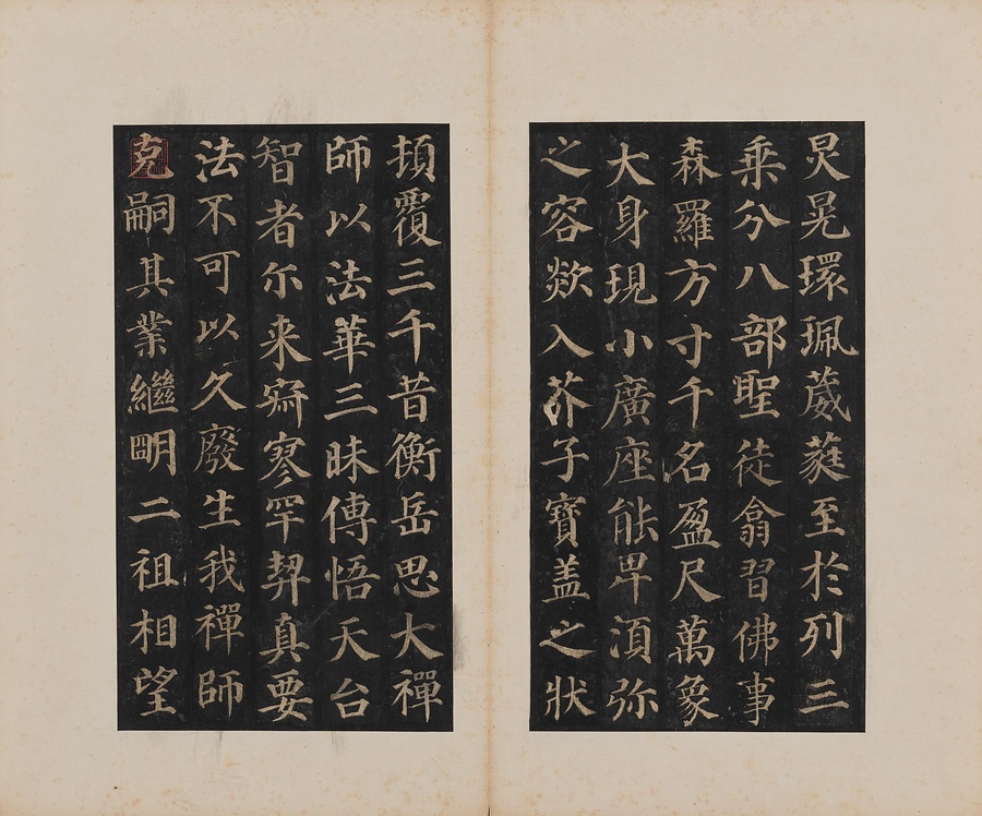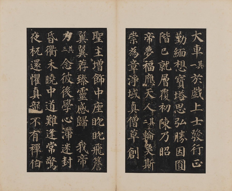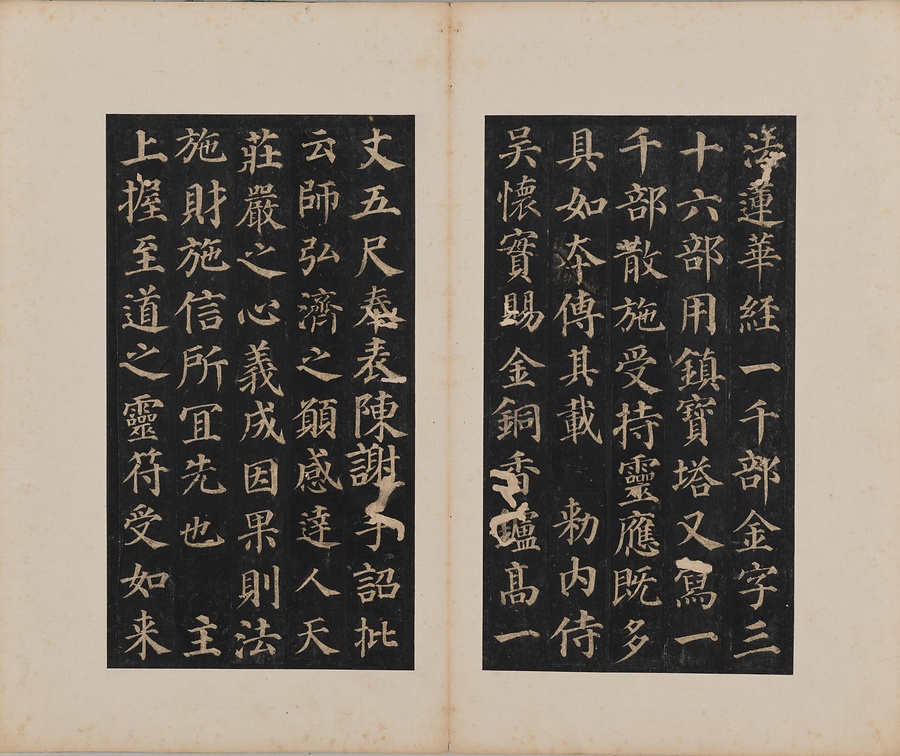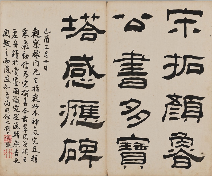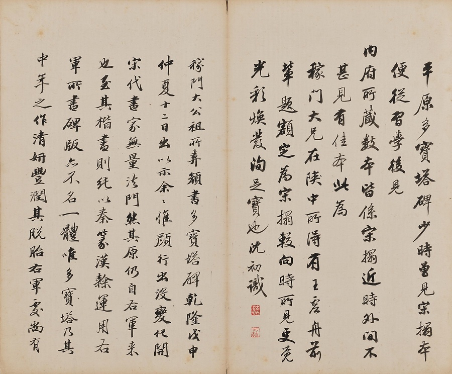 長安の千福寺の多宝塔の建立経緯を記した石碑。本文は唐の能書、顔真卿の44歳時の書。碑石は西安碑林博物館に現存します。本作は碑帖に精通した清の王澍@おうじゅ@が鑑定した宋拓本。摩滅が少なく文字の輪郭が鮮明です。王澍のほか、銭大昕@せんたいきん@、伊秉綬@いへいじゅ@、王文治@おうぶんち@ら碑学・帖学の名家が題跋を付します。