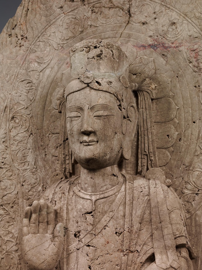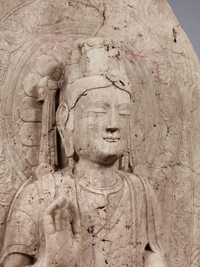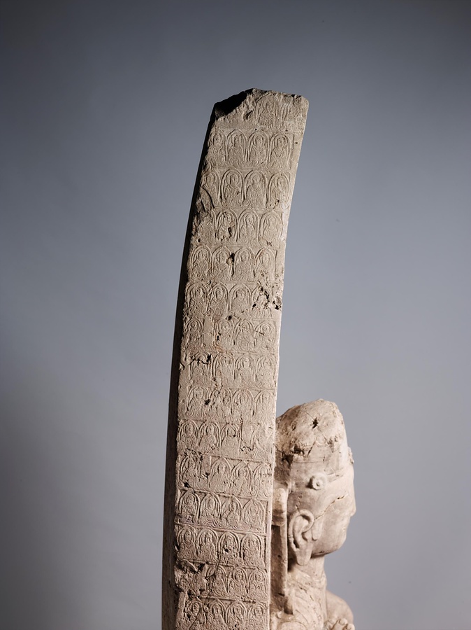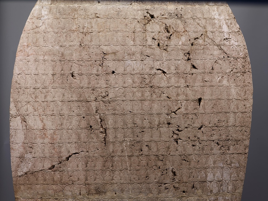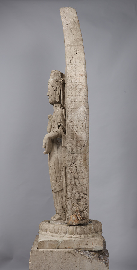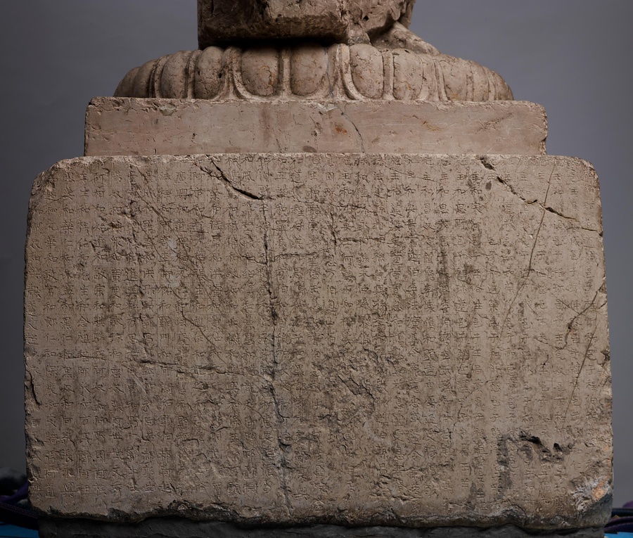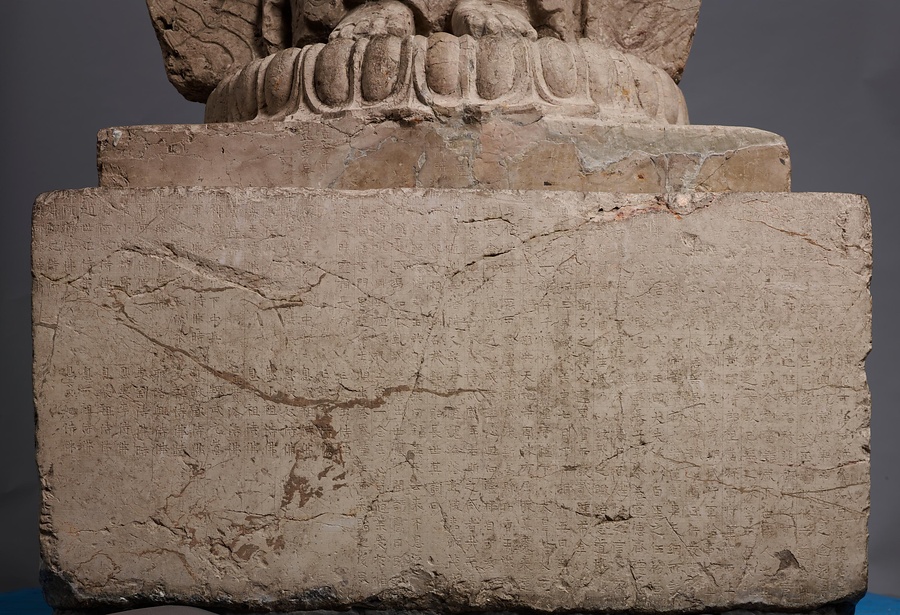 台座の四面に2000字を超す銘文が刻まれていますが、その多くは結縁@けちえん@した人々の名前です。正面には、討寇将軍兼長子県令が、妻、一族、郷里の人々の助成結縁を得て、北斉の皇帝文宣帝@ぶんせんてい@、大皇太后@たいこうたいごう@の聖寿@せいじゅ@万才(万歳)、国民安泰を祈って像と光背の千仏を造ったと記されています。