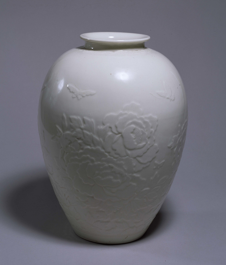 胴が長く、丸く張った肩が底に向かってすぼまった瓶(へい)です。白い土で瓶のかたちをつくり、上から釉薬というガラスを多く含んだ液をかけ焼き上げています。全体の色は、柔らかさを感じさせる白一色で洗練された印象を与えます。胴には六輪の牡丹がぐるりと囲むように配置され、肩の部分は大きな余白に五頭の蝶が飛んでいます。これらの文様は、胴の土を盛り上げたり彫り込んだりしながら浮き出すようにあらわし、葉脈などの細かい部分は線で彫り出しています。作者の三代清風与平(せいふうよへい)は、幕末から明治時代の人で、京都の陶工の清風家に養子に入り、明治11年(1878年)には三代目の名を継ぎました。与平は中国の陶磁器に大きな影響を受け、その表現にならいつつ多くの新しい技法を生み出して独自の表現をみせるようになりました。この瓶も、中国・清時代の磁器を参考にしたとみられますが、柔らかみのある白い色調と優しく浮き上がる文様は与平独自の表現で余韻を感じさせます。明治26年(1893年)にアメリカで開催され、世界各国の物産が集まったシカゴ・コロンブス博覧会に出品され、特に好評を博しました。