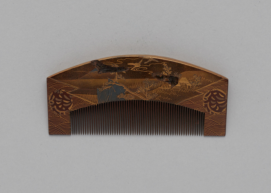 柞(いす)製、、町形、角棟の挿櫛である。町形の形状は、京都で宝暦9年(1759)に刊行された『圖式雛形/蒔繪大全』に図示され、また江戸では高原形とも呼ばれて明和・安永期(1764~1781)に流行したともされる。松皮菱の内に芦雁と山水、両端に青海波模様を研出蒔絵と高蒔絵で表す。棟は金地に蒔絵している。花柳章太郎(1894~1965)の旧蔵品で平成15年(2003)に遺族の青山久仁子氏より国立劇場へ寄贈された。
