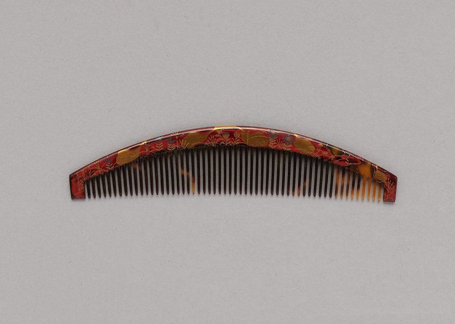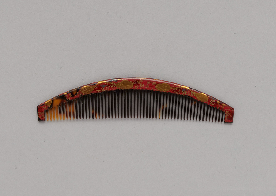 鼈甲製、吾妻形の挿櫛である。吾妻形は、江戸で流行の形状で、『玳瑁亀圖説』によると弘化年中(1845~9)に流行したとされ「月形耳切櫛 一名東形」と記される。鼈甲の斑の部分を朱漆塗と金地とし、秋草を平蒔絵で表す。花柳章太郎(1894~1965)の旧蔵品で平成15年(2003)に遺族の青山久仁子氏より国立劇場へ寄贈された。