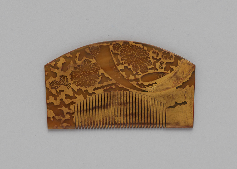 擬鼈甲製、山高形、角棟の挿櫛である。山高形は、享保6年(1721)『女要珠文庫』で「京かた」と記されるものに近く、『玳瑁亀圖説』では江戸で享保・元文年間(1716~1741)に流行したとされ、概ね18世紀前半に流行した形状とみられる。菊、短冊、筆を残して総体金地に蒔絵している。謡曲<菊慈童(枕慈童)>の留守模様である。花柳章太郎(1894~1965)の旧蔵品で平成15年(2003)に遺族の青山久仁子氏より国立劇場へ寄贈された。
