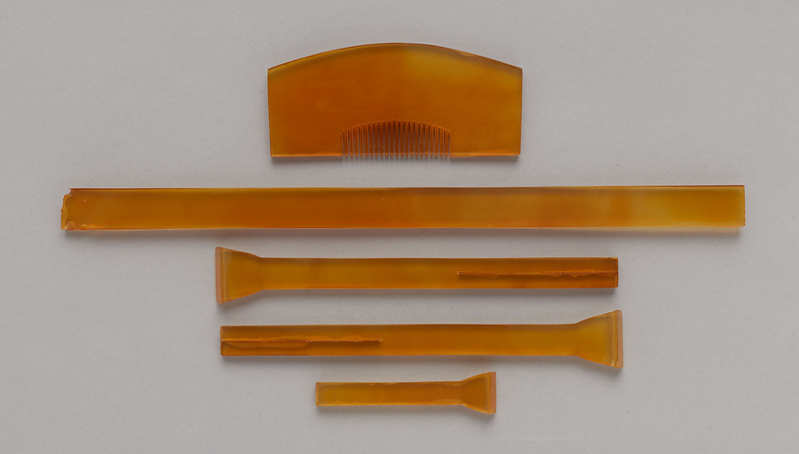 鼈甲に擬した馬爪(ばず)製、深川利休形のやや小ぶりな挿櫛と笄、角耳の前小僧・位置止の揃いである。鼈甲櫛は舶載の高級品で大ぶりなものが好まれたが、『玳瑁亀圖説』によると文政8年(1825)頃から小型化が始まった。深川利休形もそのころ流行した形状のひとつで、京・大坂にも伝播した。京・大坂のものは親歯の幅が広い。角耳は『玳瑁亀圖説』では京耳ともされ、京・大坂から伝播し、江戸では弘化頃以降に流行した。花柳章太郎(1894~1965)の旧蔵品で平成15年(2003)に遺族の青山久仁子氏より国立劇場へ寄贈された。