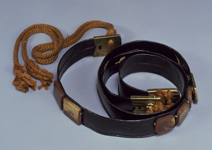 装束の1つである石帯は、近世以前のものとしては稀有の例として注目され、さらにその袋も類品なく風俗史・染織史においてまことに貴重な資料である。いわゆる錦の上差袋(うわざしぶくろ)で別組の飾紐が上差されている。錦は赤地に萌葱、黄、白(ほとんど剥落)の絵緯(えぬき)を用いて小さな鶴丸文様を互(ぐ)の目(め)にあらわしたもので、緯糸がゆるやかに浮いた特色から、浮文錦(うきもんにしき)に分類される。この一種稚拙感のある柔らかな風合いは当代ならではのものといえよう。