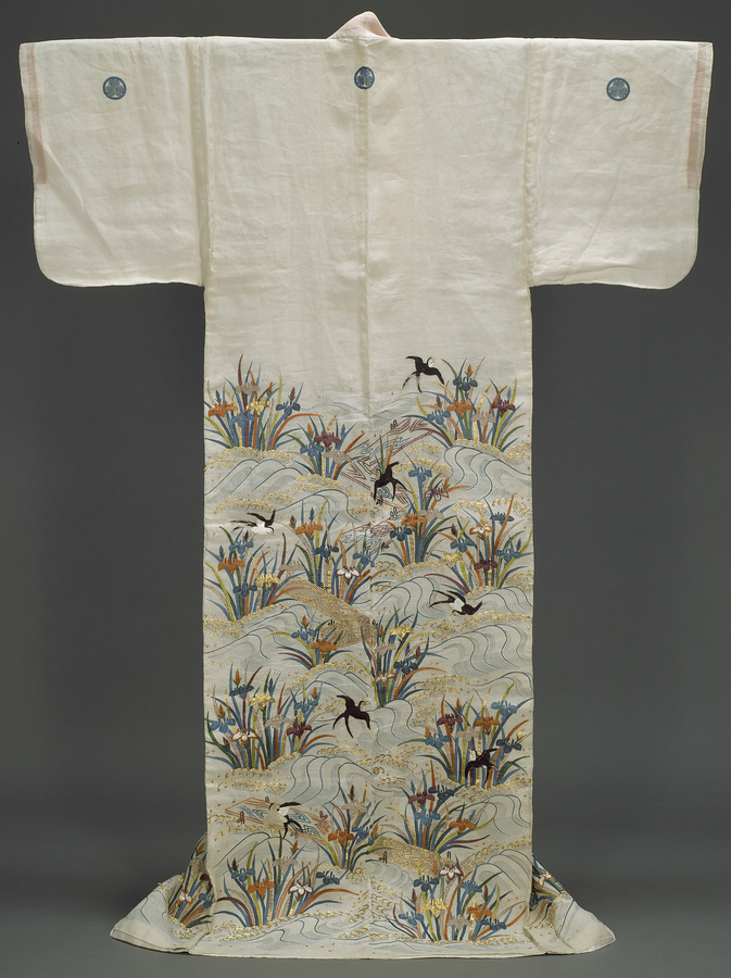 三葉葵の五つ紋付きで、腰から下のみに文様を入れる構成であることから、徳川・松平家ゆかりの御殿女中が主家から拝領した帷子と考えられる。帷子は旧暦の六月から八月まで着用する夏の衣服。御所解文様の帷子は、式日などの改まった日に武家女性が着用した。