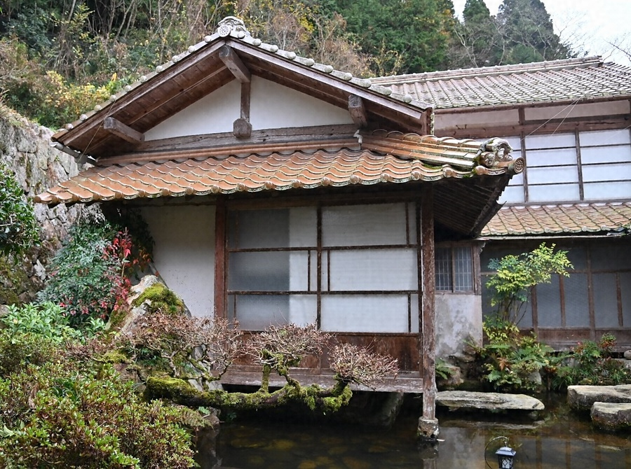 主屋南東に位置する賓客用の座敷棟。二階建入母屋造桟瓦葺の東西棟とし、北東に平屋建切妻造桟瓦葺南北棟の角座敷を池に張出し、全体に矩折れの平面とする。各階に床構え付き座敷を二室ずつ配し、二階南西室は、床脇に円形の下地窓を開けた瀟洒なつくり。