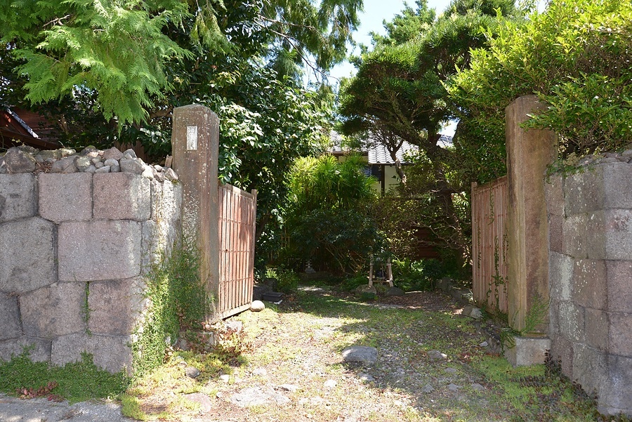 島原城跡三の丸南東部に位置する住宅の門及び石塀。門は基礎石上に立つ高さ2・3メートルの石造角柱で表面は粗い割石仕上とする。門両脇に続く石塀は安山岩を切込み矧ぎで積上げ、出隅に反りを付け上部に割石を積む。通りに面し旧城下の歴史的景観をつくる。