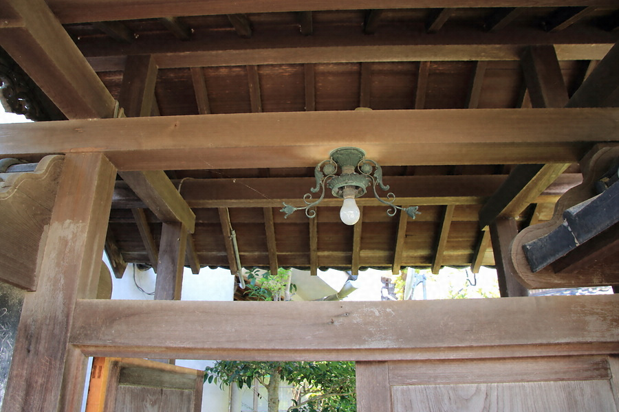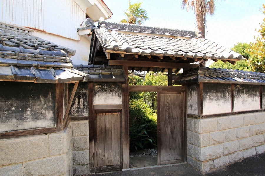 敷地東辺に沿って建つ門及び塀。門は一間一戸の薬医門で、主柱と控柱間に架けた梁上に束を立てて棟木を支持し、軒は一軒疎垂木とする。門の南北に延びる塀は腰高に積んだ石積上に建ち、屋根は桟瓦葺。簡素な門ながら塀と一体となって敷地東辺の構えを整える。