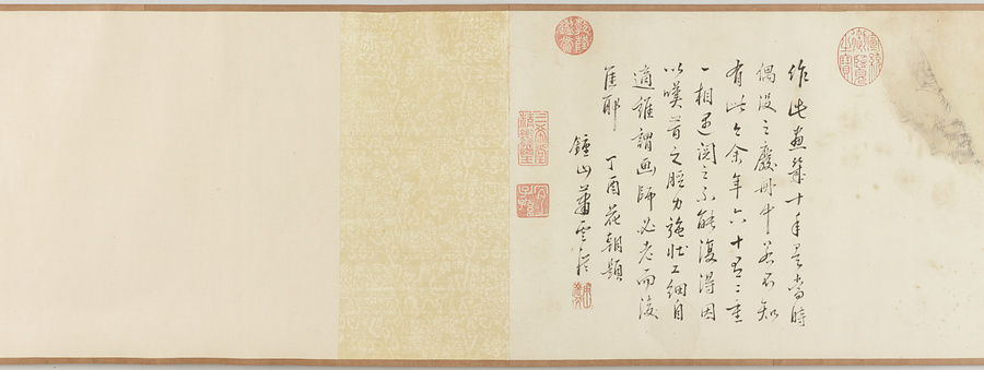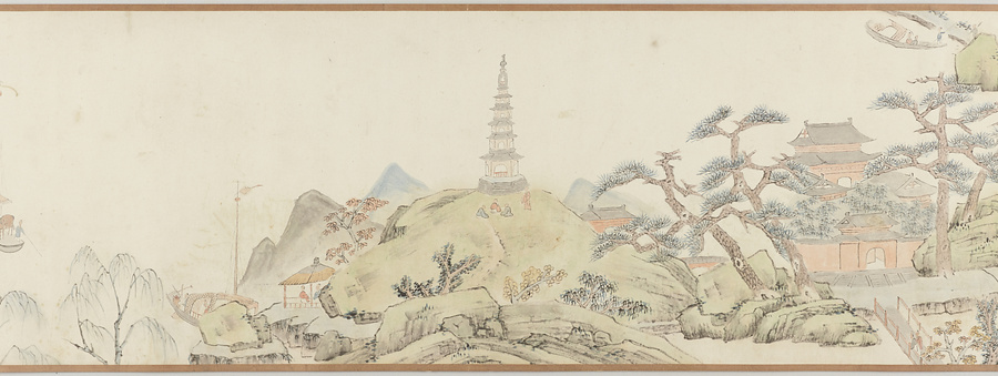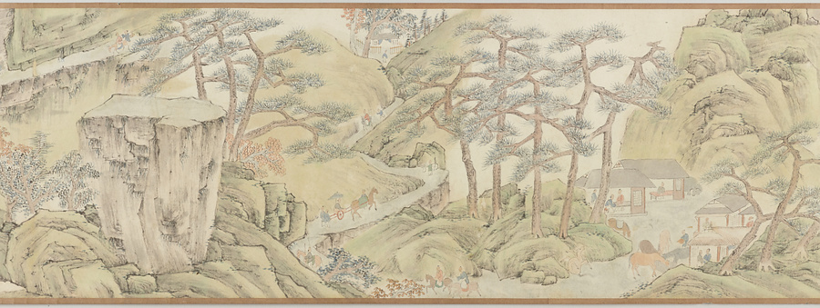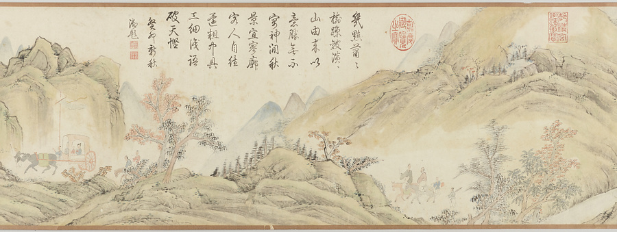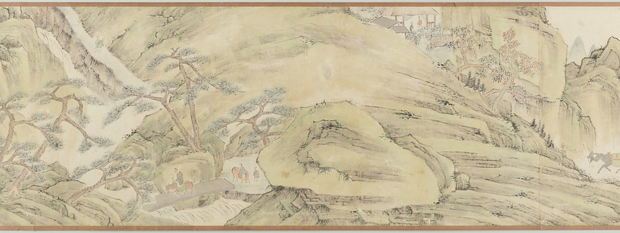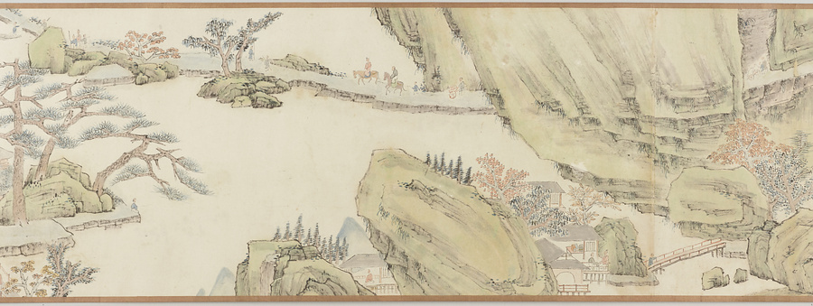 蕭雲従【しょううんじゅう】は蕪湖(安徽省)の人。明末清初の個性派画家として知られ、呉派【ごは】の画風を基礎に奇想と幻想に充ちた画風を摂取して新意ある作品を描きだしました。本図は風俗画としても興味ある内容をもつもので、清新な色彩が見事です。清の乾隆帝【けんりゅうてい】内府旧蔵品。
