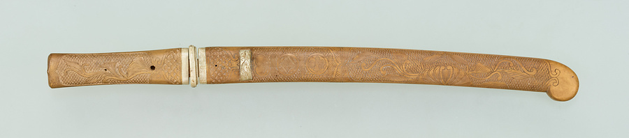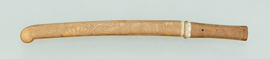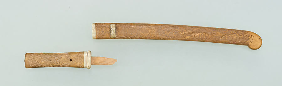 狩猟や漁労の際に用いた山刀で、マキリ(小刀)よりも刀身が長く大形のものをタシロと呼ぶ。枝の切り払いや動物の解体はもちろん、ときに熊などに遭遇した際には身を守る武器にもなった。木製の鞘+さや+や柄には見事な文様が彫刻され、ときに金属や鹿角などを嵌+は+め込んで飾られた。