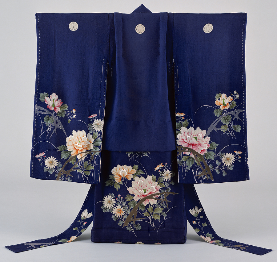 化学染料による鮮やかな紺地に、明度の高い文様がくっきりと映えている。写実的な牡丹や菊の前をさえぎるかのように入