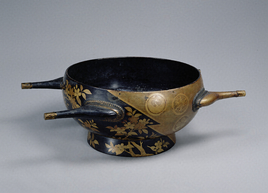 角盥は室内で化粧などをする際湯水を入れるのに用いた容器で、器体につけられた把手の形が角(つの)に似ているので、この名称がある。胴の側面を電光形に区切った片身替わりとし、絵梨子地(えなしじ)や針描(はりがき)の手法を用いるなど、桃山期に盛行した高台寺(こうだいじ)蒔絵の特色をよく示している。