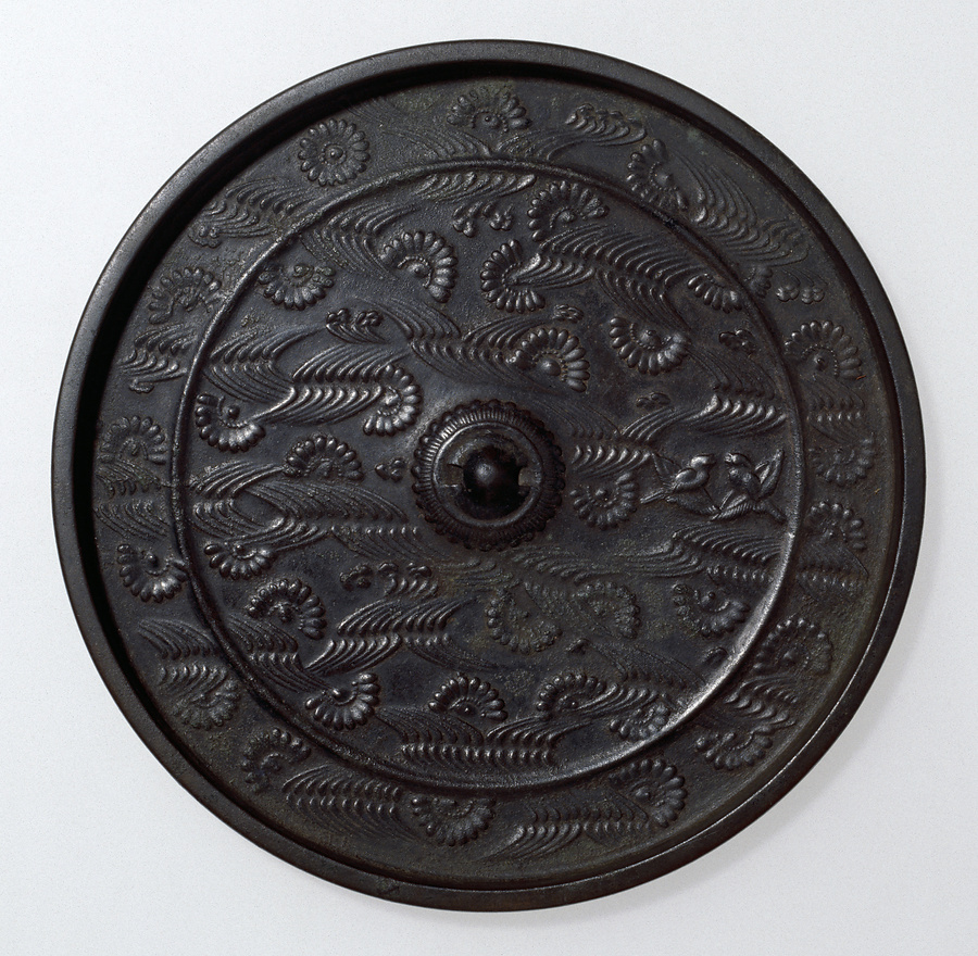 流水に散り浮かぶ菊の組み合せは、菊の甘露を飲んで不老不死となったという中国・菊慈童譚から、長寿の吉祥文として近世に至るまで様々な工芸の意匠に用いられた。鏡では、山口県上野廃寺出土の元徳三年(1331)銘鏡(東京国立博物館蔵)が早い例としてよく知られる。本鏡は、鈕座や菊花表現から見て、E甲17-36・E甲17-29から上野廃寺鏡年紀の間あたりに製作年代を置けるであろう。