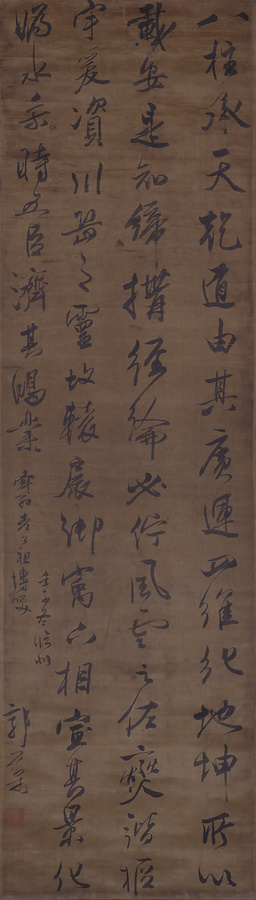 唐の太宗が書した「八柱承天帖」を流麗な行書で臨書した一幅。筆者の郭棻は字を芝仙、号を快圃といい、直隷清苑県(現河北省保定市)の人。順治九年(一六五二)の進士で、その書は沈荃とともに「南沈北郭」と並称された。清初の作だが明末の優雅さを残す本書は有竹の好むところであったのだろう。箱書きは珍しく本人が書している。
