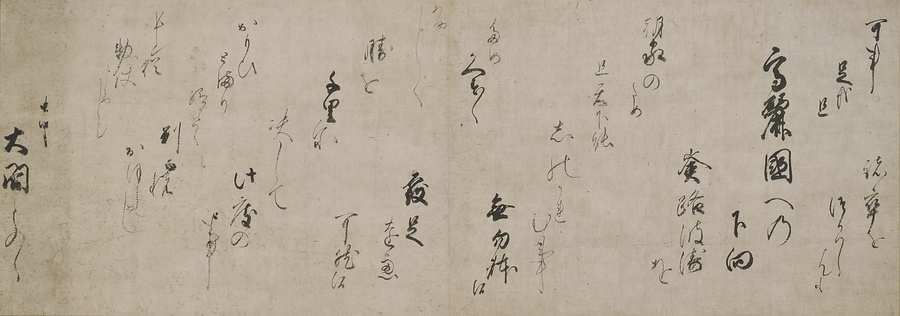 後陽成天皇(一五七一~一六一七)が文禄元年(一五九二)、「文禄の役」における朝鮮半島への自らの渡海を強行しようとした豊臣秀吉を諫めた散らし書きの消息。その渡海を「無勿躰(恐れ多い)」、朝家のためにも天下のためにも「遠慮可然(控えて当然)」として、必死に思いとどまるよう求めている。大高檀紙二紙いっぱいにわたって書かれた格調高い筆致は、二十二歳の若き天皇がすでに独自の境地を得るに至っていたことを示している。