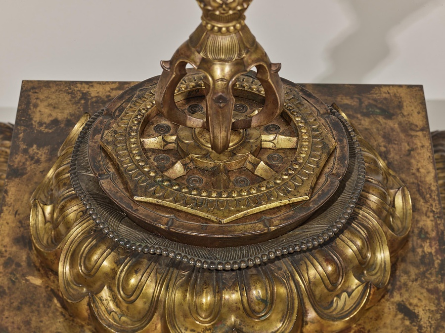 これは舎利を収める容器です。それぞれのパーツを銅の鋳造で作って金メッキし、組み合わせてできています。上の部分は火炎宝珠といい、火炎をまとった宝の珠(たま)を表しています。この宝珠はてっぺんの部分が蓋(ふた)になっており、開けると中は空洞で、容器の役割をはたします。実は鎌倉時代13世紀以降の舎利容器は、こうした火炎宝珠形がもっとも多いのですが、この作品では宝珠から下の部分に、きわめて特殊なデザインが採用されています。四角形の基壇の上に、密教の儀式で使われる、五鈷杵(ごこしょ)とよばれるシャープな形の法具を立て、あたかも密教法具(みっきょうほうぐ)が舎利容器を支えるかのような構成をとっているのです。こうした特徴から、密教における舎利礼拝の儀式で安置されたと考えられます。