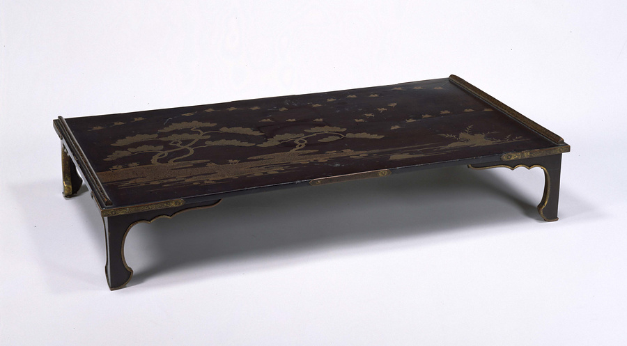 文台は、書物や硯箱(すずりばこ)、短冊(たんざく)などを載せる小振りの机です。本品は、天板の両端に筆返しが付き、上面に州浜(すはま)に松、飛び交う千鳥などを金蒔絵(まきえ)で表しています。この種の図様(ずよう)は室町時代の作品に類例があり、甲斐(かい)国(現在の山梨県)の歌枕(うたまくら)「塩山」(しおのやま)を表したと考えられます。蒔絵は、蒔絵粉の上に漆を塗った後、表面を炭で研(と)いで文様(もんよう)を現す研出(とぎだし)蒔絵を主体に、州浜や貝は蒔絵粉をまばらに蒔く絵梨子地(えなしじ)としており、技法にもこの時代の特色が現れています。足利義政(あしかがよしまさ)(1436~90)奉納と伝えられます。