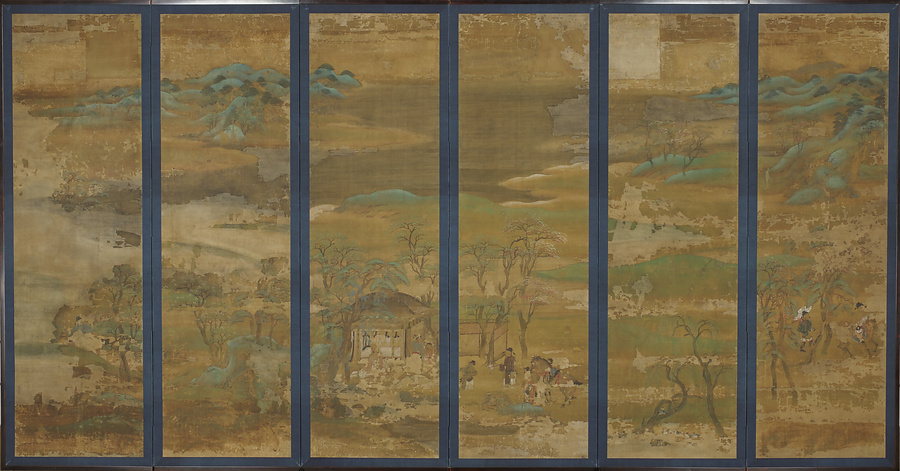 山水屏風は真言宗の密教で潅頂(かんじょう)(仏弟子になるときの儀式)を行なうとき、その道場で用いられるが、本来は平安貴族の邸宅で用いられたものらしい。この屏風は、広々とした風景の下方に、草堂に隠棲して詩作にふける老翁と、それを訪問する貴公子の主従を描いている。平安時代に流行した唐絵(からえ)の珍しい例で、登場人物はすべて唐風に描かれているが、この老翁こそ中国唐代の詩人白楽天であろうと考えられている。しかし、絵画技法の上からみると、人物・山・水・樹木・岩石など、すべて温和で情趣的な日本化の傾向が著しく、平安時代後期の制作と思われる。